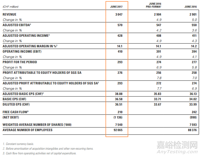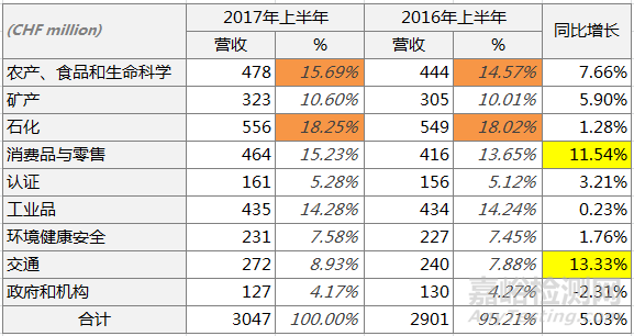 近日,SGS集團(tuán)發(fā)布了2017年半年報(bào),上半年實(shí)現(xiàn)營(yíng)業(yè)收入30.47億瑞士法郎,按固定匯率計(jì)算,收入增長(zhǎng)4.9%,其中有機(jī)增長(zhǎng)貢獻(xiàn)率為3.4%,其余為近期收購(gòu)公司收益貢獻(xiàn)。同2016年同期相比收入增長(zhǎng)5.0%。運(yùn)輸服務(wù)(15.0%)、消費(fèi)品及零售(12.0%)業(yè)務(wù)線均實(shí)現(xiàn)雙位數(shù)增長(zhǎng),同時(shí)上半年完成4項(xiàng)收購(gòu)。