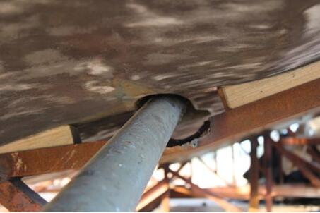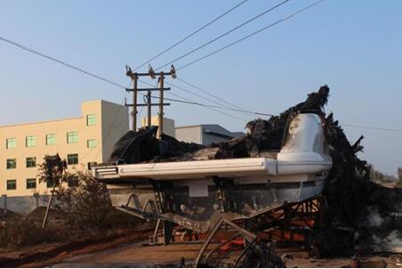 我單位鑒定人員對涉案游艇的燒毀情況進行了調(diào)查,涉案游艇燒毀嚴重,除底部外殼保留完好外,其他部分完全燒毀。調(diào)查中發(fā)現(xiàn)涉案游艇起火位置位于10KV高壓線下方,游艇的螺旋槳軸對地腳車固定處存在明顯放電電弧痕跡,地腳車與拖車之間的連接鋼絞線有明顯對地放電痕跡。
