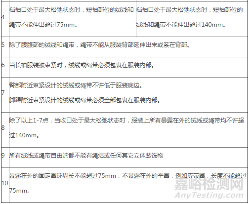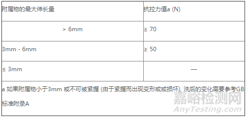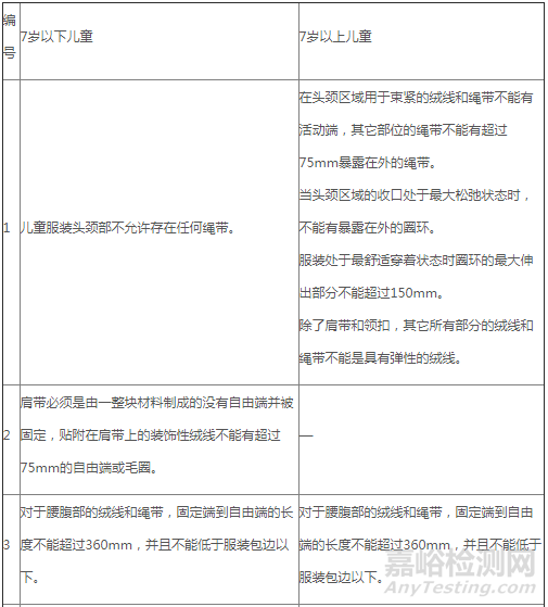 機械性能安全方面,標準要求嬰幼兒及7歲以下兒童服裝的頭頸部不允許存在任何繩帶,標準對紡織附屬物也做出了規(guī)定,要求附屬物應具有一定的抗拉強力,且不應存在銳利尖端和邊緣。另外針對與嬰幼兒貼身服裝,標準要求其商標必須縫制在不與皮膚直接接觸的位置,詳細內容請參見下表2、3: