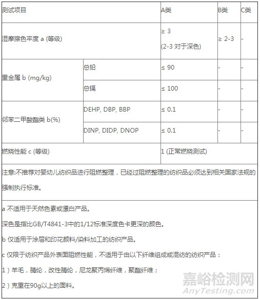 在化學安全方面,標準針對有涂層或印花的紡織品,增加了6種增塑劑和鉛、鎘2種重金屬的限量要求;考慮到兒童的特殊性,標準也規(guī)定了濕摩擦色牢度的參數指標;另外在備注中還明確指出不建議對嬰幼兒產品進行阻燃整理,并規(guī)定了嬰幼兒及兒童紡織品的燃燒性能要求,詳見下表1。