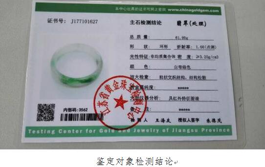 為進一步驗證,華碧鑒定人將樣品送至江蘇省黃金珠寶檢測中心做了進一步檢測。樣品總重量61.99g,形狀環(huán)形,點測折光率1.66,光學特性非均質(zhì)集合體,密度大于等于3.2g/cm3,顏色淡綠色,放大檢查系粒狀交織結構、結構松散,大型儀器分析具紅外特征圖譜,主石檢測結論翡翠(處理),尺寸為56mm*15mm*7mm。