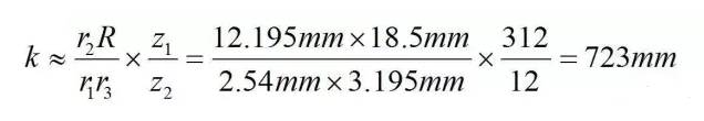r1=2.54mm,r2=12.195mm,r3=3.195mm,指針長R=18.5mm,z1=312,z2=12,則其傳動放大比k為: