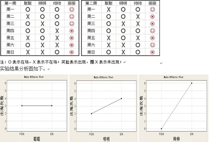DOE是研究如何制定實驗方案,以提高實驗效率,縮小隨機誤差的影響,并使實驗結(jié)果能有效地進行統(tǒng)計分析的理論與方法。其基本思想是英國統(tǒng)計學家R.A. Fisher提出的。在這個案例中有三個因子(Factor):聰聰、明明和帥帥,在實驗中所有因子都有計劃地被故意改變,并測量每次實驗組合時的響應;當事人有兩種狀態(tài):在場和不在場,這種因子被故意改變的狀態(tài)就稱為水平(Level)。一個有效的實驗設計可以在同一次試驗中改變多個因子,這將大大降低實驗的次數(shù),而且能夠獲得足夠的信息使結(jié)果可信。