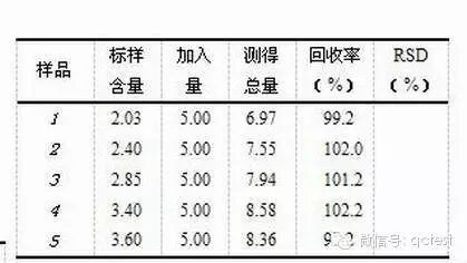 為驗證此方法的準確度和精密度,特選取5個標準樣品按此方法進行測試,并加入標準進行回收試驗,測定結果見表5。