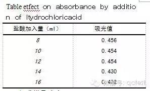 對銅標準系列溶液中,加入不同量的鹽酸溶液(1+1),按1.2實驗方法測定銅的吸光值。增大標準系列溶液的酸度,對其結果的影響見表4。
