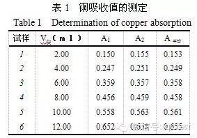 用原子吸收分光光度計在最佳工作條件下測定吸光度,以銅濃度為橫坐標,吸光度為縱坐標繪制標準曲線。實驗數據見表1。