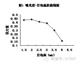 空心陰極燈的發(fā)射特性依賴于燈電流,因此在原子吸收分析中,為了得到較高的靈敏度和精密度就要選擇適當的燈電流。通過改變燈電流,測定不同的燈電流下銅標準溶液吸光值(見圖1)