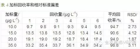 (2)精密度實驗。對不同濃度的標準溶液進行吹脫捕集前處理,隨后進離子色譜檢測,每個水平做6次平行實驗,樣品的回收率良好,平均回收率均>90%,且各平行相對標準偏差均不超過5%,重現(xiàn)性良好,結(jié)果見表 4。
