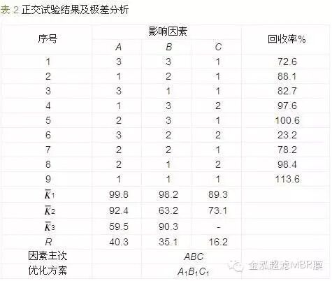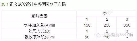 從表 2可以看出,因子A水樣加入量的R值較大,即加入水量的多少會顯著影響回收率,其中 1> 2> 3,故水樣加入量優(yōu)先選擇150 mL;B因子對測定也有一定影響,由于 1> 3> 2吹氣方式選1;C因子對回收率的影響相對較弱,因 1> 2,吸收液量選取50 mL。按極差分析得出的優(yōu)化方案為A1B1C1即第9組試驗,其回收率為113.6%>>100%,可推測其受外界干擾因素較多,不符合優(yōu)化條件的選擇。由于顯著影響因子A的水平1、2的 相差較小,并且實驗發(fā)現(xiàn)組合為A2B1C1時平均回收率為99.7%(n=6,RSD=5.63%),綜合考慮后選取A2B1C1為最優(yōu)條件。