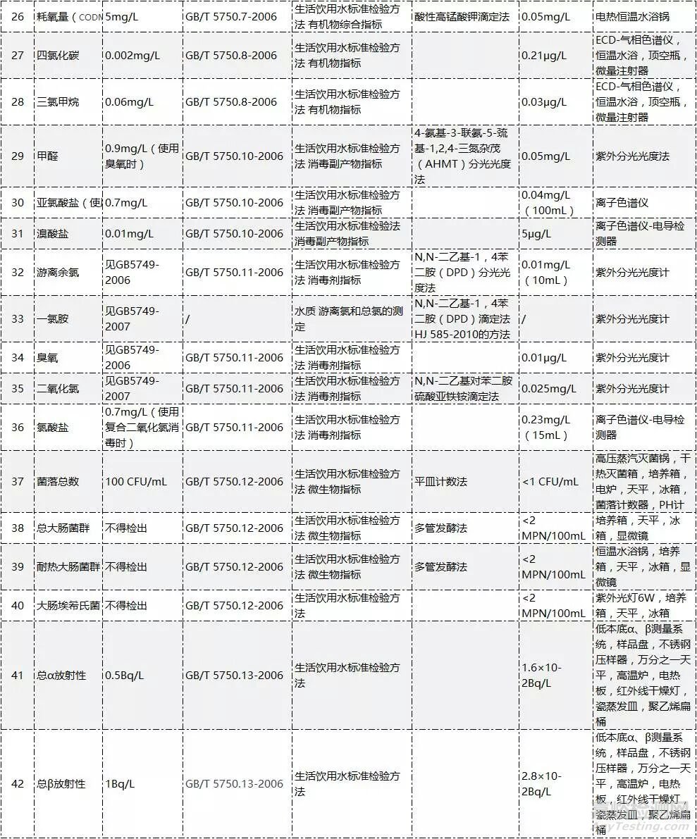 以下列出了這42項常規(guī)檢測參數(shù),和其對應的檢測方法標準號、標準名稱及主要儀器設備。