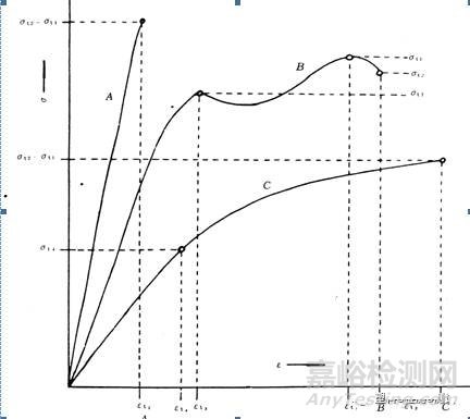 σt1—拉伸強(qiáng)度;εt1—拉伸強(qiáng)度時(shí)的應(yīng)變;σt2—拉伸斷裂應(yīng)力;εt2—拉伸斷裂時(shí)的應(yīng)變;σt3—拉伸屈服應(yīng)力;εt3—屈服時(shí)的應(yīng)變;σt4—偏置屈服應(yīng)力;εt4—偏置屈服時(shí)的應(yīng)變;A—脆性材料;B—具有屈服點(diǎn)的韌性材料;C—無屈服點(diǎn)的韌性材料。