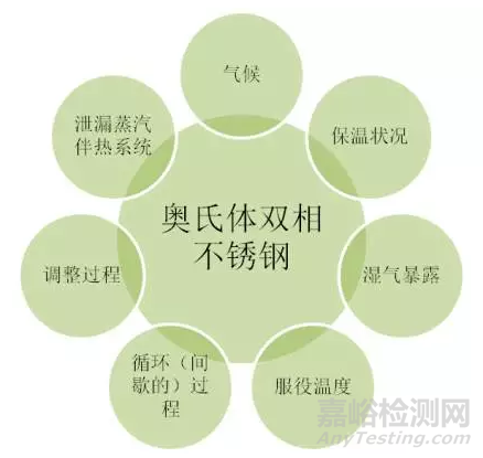 奧氏體和雙相不銹鋼保溫層下的腐蝕是一種外部氯化物應(yīng)力腐蝕開裂形式,所有應(yīng)力腐蝕開裂的形成,是當(dāng)敏感的金屬在一個腐蝕環(huán)境和殘余拉伸應(yīng)力共同作用下,裂紋便產(chǎn)生了。
