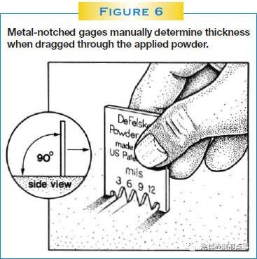金屬缺口計。這儀器通過手拖過涂覆的粉末手動地測量厚度。與濕膜測厚儀的工作原理類似,儀器確定的粉末高度值是在做有一個記號的、并且有粉末粘附在上面的最高編號的齒和沒有留記號的、沒有粉末粘附在上面的第二高的齒之間的高度。這些簡單的工具便宜,但只能精確到幾密爾。測量能夠在一個合適的剛性底材進(jìn)行,但記號將會在當(dāng)粉末在固化過程中流動時沒有被覆蓋的粉末中標(biāo)記。