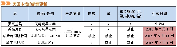 羅克蘭縣命名的“無(wú)毒玩具法案”已經(jīng)于2015年生效,但于今年二月再被本地法案號(hào)7修改其要求,刪除了化學(xué)物質(zhì)的限制要求。同時(shí)紐約的蘇??丝ぃ固貜厮固乜?,奧爾巴尼郡將于稍后通過(guò)有毒化學(xué)物質(zhì)的限制要求。有關(guān)詳情如下: