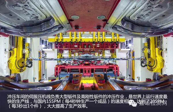 沖壓車間的伺服壓機(jī)線負(fù)責(zé)大型鈑件及高剛性鈑件的沖壓作業(yè),是世界上運(yùn)行速度最快的生產(chǎn)線,與國內(nèi)15SPM(每4秒鐘生產(chǎn)一個(gè)成品)的速度相比,達(dá)到了20SPM(每3秒出1個(gè)件),大大提高了生產(chǎn)效率。從切換效率的角度來看,高速沖壓線上75%的模具可在鋼鋁材質(zhì)間進(jìn)行無縫切換,既可用于伺服線也可用于機(jī)械線。所以沖壓車間90%的自動化率源自于此。