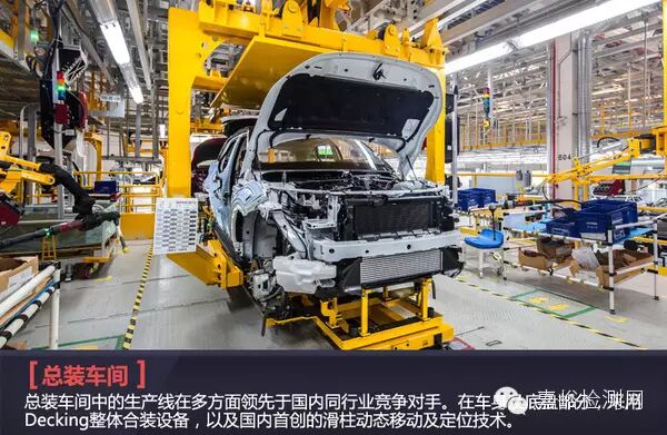 總裝車間中的生產(chǎn)線在多方面領(lǐng)先于國內(nèi)同行業(yè)競爭對手。在車身及底盤部,采用Decking整體合裝設(shè)備,以及國內(nèi)首創(chuàng)的滑柱動態(tài)移動及定位技術(shù)。內(nèi)飾部分,采用可升降平板輸送形式,集成了無線漏波通訊技術(shù)、臺車自帶可編程控制系統(tǒng)以及PCV編碼精確定位系統(tǒng),利用自動化實(shí)現(xiàn)了人機(jī)工程,自動調(diào)節(jié)車身放置高度,達(dá)到最適合的裝車高度,并實(shí)現(xiàn)了柔性化生產(chǎn),可容納3款車型??傃b車間在內(nèi)飾和門線采用AGV形式的SPS配送,減少了配送人員,同時(shí)降低了員工取件時(shí)間和拿錯(cuò)零件的風(fēng)險(xiǎn)。部分大件采用AGV或JIT形式配送,如發(fā)動機(jī)、座椅、車輪等。