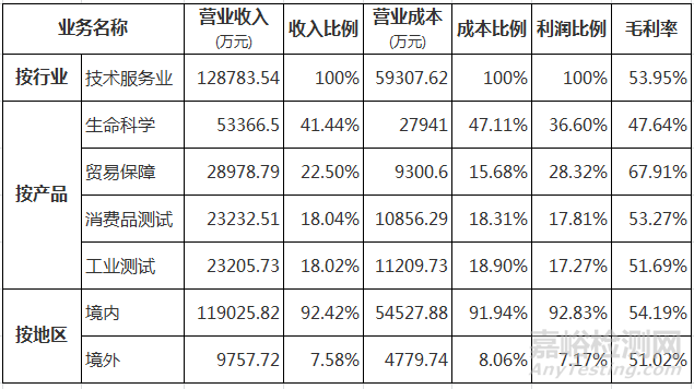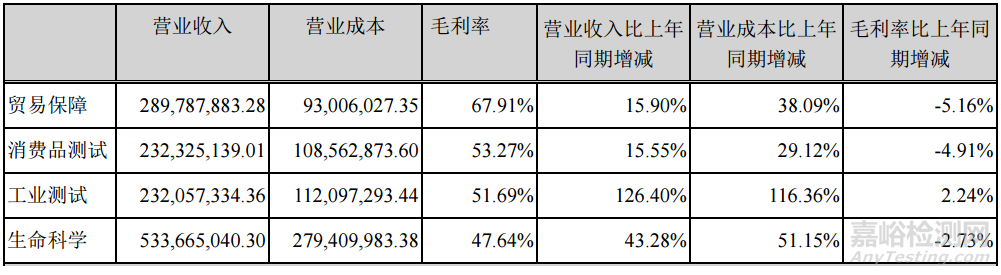 營業(yè)收入增長領(lǐng)先的為生命科學(xué)和貿(mào)易保障,而毛利潤下降較快的是貿(mào)易保障和消費(fèi)品測試,僅有工業(yè)測試毛利潤提升,見下圖