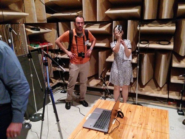 在這個(gè)消音室中,你會(huì)有種要窒息的感覺(jué),說(shuō)話也變得奇怪起來(lái),因?yàn)槁曇魰?huì)被墻壁和天花板反彈。這個(gè)消音室通常用于測(cè)試服務(wù)器機(jī)架的噪聲,或者測(cè)試麥克風(fēng),操作員在筆記本電腦前,對(duì)十幾個(gè)麥克風(fēng)進(jìn)行測(cè)試,標(biāo)記處特定類型的麥克風(fēng),如果噪音低于20db就已經(jīng)達(dá)到人類感知的極限水平。