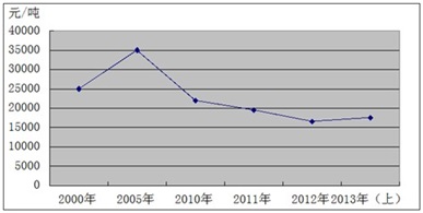 圖2 2000~2013有機(jī)硅單體價格走勢