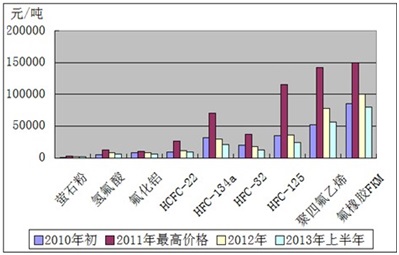 圖1 近年氟化工主要產(chǎn)品價格走勢