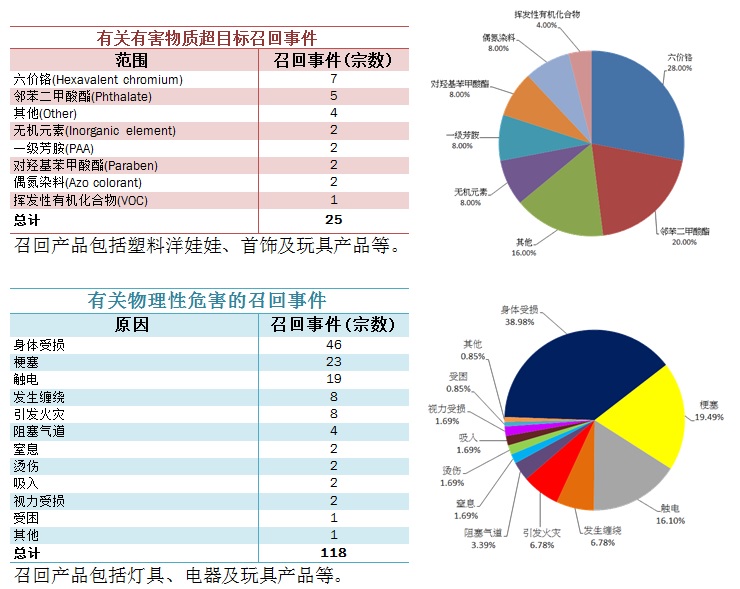 歐盟非食用消費(fèi)品快速通報(bào)系統(tǒng)(RAPEX)的成立目的,是讓委員會(huì)及成員國(guó)之間可以交換產(chǎn)品被召回的信息,以防止或限制市場(chǎng)上銷售的產(chǎn)品對(duì)消費(fèi)者健康或安全帶來潛在風(fēng)險(xiǎn)。而食品、藥品和醫(yī)療設(shè)備都不涉及RAPEX的監(jiān)管中,并由其他機(jī)構(gòu)監(jiān)控。以下的圖表顯示了于2016年3月RAPEX涉及有害物質(zhì)超標(biāo)和物理性危害的召回事件。