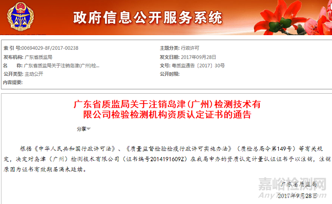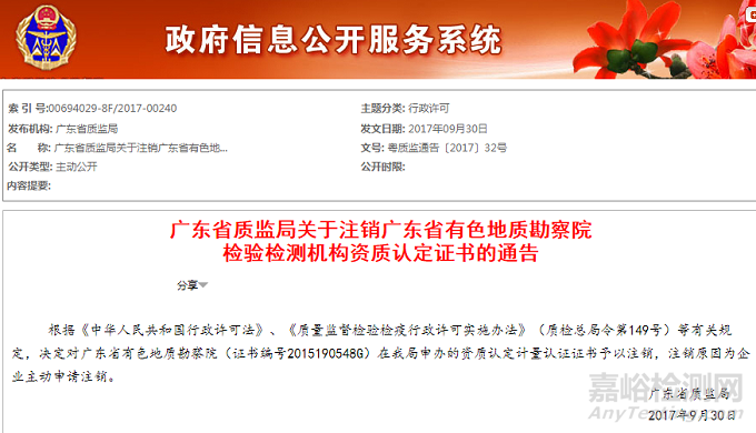 近日,廣東省質(zhì)監(jiān)局注銷島津(廣州)檢測技術有限公司、廣東省有色地質(zhì)勘察院檢驗檢測機構CMA資質(zhì),通知原文如下:
