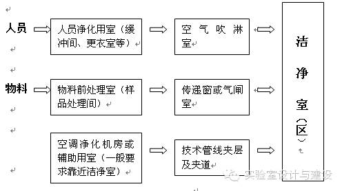 潔凈實(shí)驗(yàn)室主要是通過人為的手段,應(yīng)用潔凈技術(shù)實(shí)現(xiàn)控制室內(nèi)空氣中塵埃、含菌濃度、溫濕度與壓力、以達(dá)到所要求的潔凈度、溫濕度和氣流速度等環(huán)境參數(shù)??諝鉂崈舳仁侵笣崈艨諝猸h(huán)境中空氣含塵量程度,空氣潔凈度的級(jí)別以含塵濃度劃分。潔凈度是指每升空氣中所含粒徑≥0.5um的塵粒的總顆粒。我國(guó)空氣潔凈等級(jí)標(biāo)準(zhǔn)分為:100級(jí)、1000級(jí)、10000級(jí)、100000級(jí)。國(guó)際標(biāo)準(zhǔn)則劃分為:1級(jí)、2級(jí)、3級(jí)、4級(jí)、5級(jí)。潔凈室的組及其相互關(guān)系如圖所示: