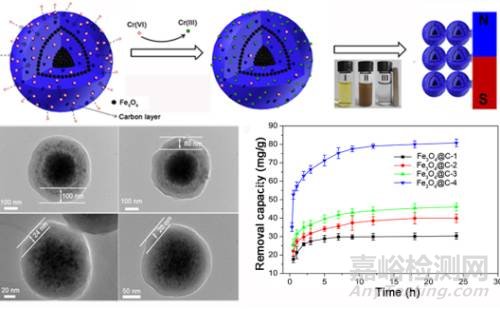 吳正巖課題組制備出一種結(jié)構(gòu)可控的磁性多孔納米復(fù)合材料,其粒徑、碳層厚度和活性基團(tuán)數(shù)量可由前驅(qū)物質(zhì)濃度方便調(diào)節(jié)。該材料具有多孔結(jié)構(gòu)、高比表面積和大量活性基團(tuán),可以高效抓取水體中的六價(jià)鉻,進(jìn)而將其還原為微毒性的三價(jià)鉻,并通過磁場(chǎng)將該材料連同鉻移出水體。該方法環(huán)境友好、工藝簡單、成本低、可重復(fù)利用,具有較高的應(yīng)用價(jià)值,為修復(fù)重金屬污染提供了強(qiáng)有力的技術(shù)支撐。