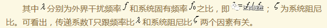傳遞系數(shù)又稱傳遞率,主動(dòng)隔振的傳遞系數(shù)是通過隔振器傳到地基上的力幅與激振力幅之比,即力傳遞系數(shù);被動(dòng)隔振的傳遞率則是隔振后物體的振幅與地基的振幅之比,即位移傳遞系數(shù)。它們具有相同的表達(dá)式: