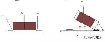 當(dāng)貼片時,由于焊墊的不平或焊膏的滑動,造成片感偏移了θ角。由于焊墊熔融時產(chǎn)生的潤濕力,可能形成以上三種情況,其中自行歸正為主,但有時會出現(xiàn)拉的更斜,或者單點拉正的情況,片感被拉到一個焊盤上,甚至被拉起來,斜立或直立(立碑現(xiàn)象)。目前帶θ角偏移視覺檢測的貼片機(jī)可減少此類失效的發(fā)生