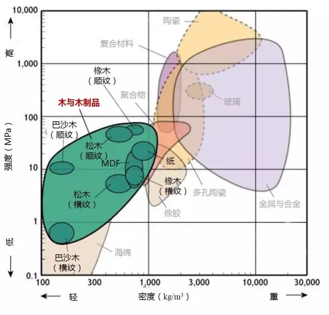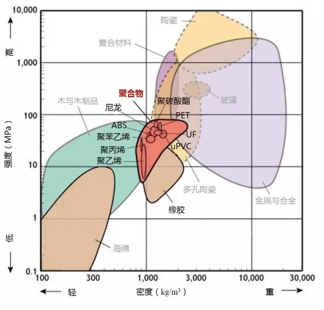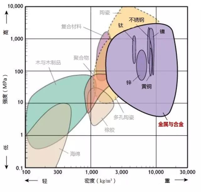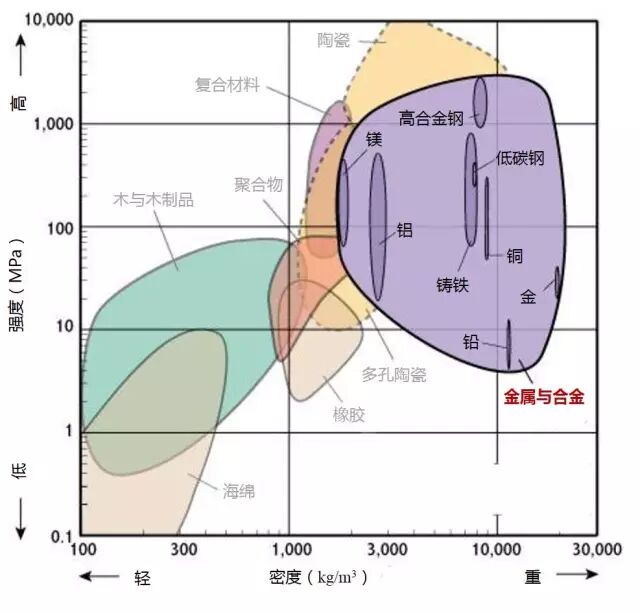 2、高強(qiáng)度且低密度的材料位于圖形的左上部分。