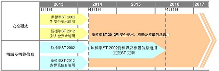 從2014年4月1日開始,所有ST申請(qǐng)都要符合ST 2012 的安全要求,標(biāo)簽信息除外?,F(xiàn)有產(chǎn)品的標(biāo)簽信息符合ST 2002(第11版)的,可一直沿用到2016年3月31日。