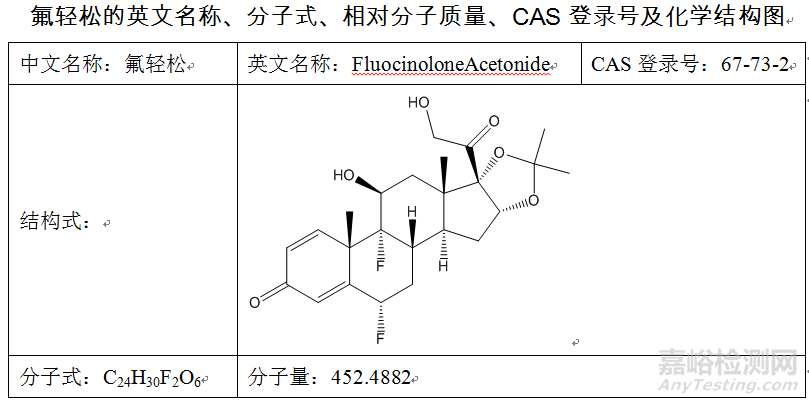3.8 標(biāo)準(zhǔn)物質(zhì):氟輕松,純度不小于99.0%;標(biāo)準(zhǔn)物質(zhì)的分子式、相對(duì)分子質(zhì)量、CAS登錄號(hào)、化學(xué)結(jié)構(gòu)圖參見附錄A。