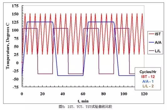 不管是TCT或是TST試驗,其試驗時間都是很長的,而IST時間明顯小于TCT和TST,常見的溫度循環(huán)測試曲線如圖5所示,由圖可以看出,液冷式的TST試驗,高低溫轉(zhuǎn)換速率是最大的,IST其次,TCT最小,而高低溫轉(zhuǎn)換速率越大,其對材料的沖擊也隨之增加,也就更容易失效: