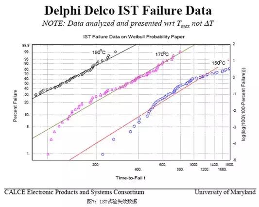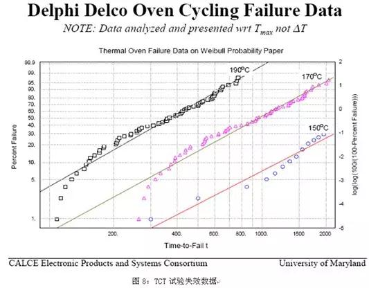 IST因為測試時間短,溫度轉(zhuǎn)換速率大,對測試樣品的疲勞老化影響也較大,故可以使試樣早早發(fā)生失效,比對圖7的IST失效數(shù)據(jù)和圖8的TCT失效數(shù)據(jù),可見在相同的條件下,IST試驗很早就發(fā)生的失效: