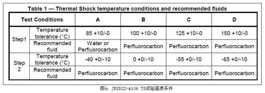 TST:參考標(biāo)準(zhǔn)JESD22-A106B,兩槽式Liquid to Liquid高低溫液體中之循環(huán)試驗,特稱為Thermal ShockTest熱沖擊試驗,試驗條件如下圖4所示:
