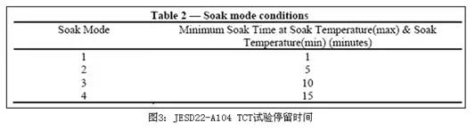 TCT:參考標(biāo)準(zhǔn)JESD22-A104E,兩箱式Air to Air溫度循環(huán)試驗(Temperature Cycling Test),共有13種高低溫匹配與4種留置時間CycleTime(1、5、10、15分鐘)的級別對應(yīng),以供用戶參考,如下圖2和圖3所示: