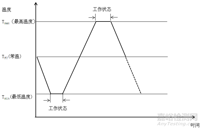 本試驗(yàn)用于較快速地驗(yàn)證試驗(yàn)品的壽命是否滿足要求。試驗(yàn)時(shí)的試驗(yàn)品工作模式除指定工作狀態(tài)外均為通電待機(jī)狀態(tài)。溫度曲線見下圖A.1所示。最高、最低試驗(yàn)溫度為Tmax、Tmin。溫度梯度為4℃/每分鐘。試驗(yàn)品在達(dá)到最高、最低工作溫度時(shí)需要保持的時(shí)間為試驗(yàn)品溫度完全浸透之后再加10分鐘。試驗(yàn)循環(huán)次數(shù)及時(shí)間按照下屬A.2描述進(jìn)行計(jì)算。