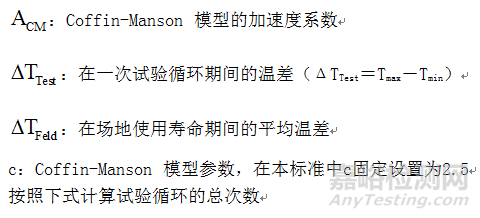試驗(yàn)采用Coffin-Manson加速模型。為了計(jì)算溫度交變耐久壽命試驗(yàn)的試驗(yàn)持續(xù)時(shí)間,需要考慮試驗(yàn)品場(chǎng)地平均溫度變化和場(chǎng)地使用壽命期間的溫度循環(huán)次數(shù)