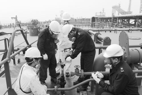 圖為日照局工作人員對“JING GANG SAN”油輪裝載的高氣相硫化氫原油進(jìn)行重量鑒定。