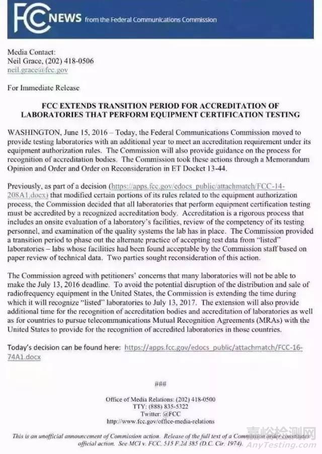 2016年6月15日,F(xiàn)CC發(fā)布文件FCC No. 16-74, 將繼續(xù)接受non-MRA 2.948-listed實(shí)驗(yàn)室出具的認(rèn)證申請和報告。過渡期延長至2017年7月13日,期間中國實(shí)驗(yàn)室和相關(guān)制造企業(yè)仍可繼續(xù)在國內(nèi)實(shí)驗(yàn)室進(jìn)行檢測和認(rèn)證申請。原文如下: