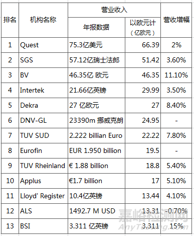 編者備注:2015年國(guó)際上市公司檢測(cè)機(jī)構(gòu)營(yíng)業(yè)收入排行榜,因部分國(guó)際知名檢測(cè)機(jī)構(gòu)未對(duì)外公布相關(guān)數(shù)據(jù),本排行榜中未包括。