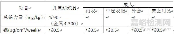 韓國(guó)KC(Korea Certification)認(rèn)證標(biāo)準(zhǔn)要求,自我監(jiān)管安全確認(rèn) (Self-Regulatory Safety Confirmation)的36個(gè)月或以下嬰兒紡織品(例如外衣、內(nèi)衣、鞋子、圍兜、帽子和無邊便帽、襯衫、裙子、短褲、床上用品等)以及需要取得安全質(zhì)量標(biāo)簽 (Safety Quality Labeling)認(rèn)證的兒童 (36個(gè)月至12歲) 和成人衣服 (例如:外衣、里衣、內(nèi)衣、校服、襯衫、手套、大衣、夾克、毛衣、帽子 / 無邊便帽、鞋子等)、床上用品、套罩、地板墊、坐墊、手提包以及皮革產(chǎn)品,其重金屬含量需要符合下列要求: