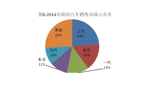 2014年,6家汽車生產(chǎn)企業(yè)(集團(tuán))產(chǎn)銷規(guī)模超過(guò)100萬(wàn),其中上汽銷量突破500萬(wàn)輛,達(dá)到558.37萬(wàn)輛,東風(fēng)、一汽、長(zhǎng)安、北汽和廣汽分別達(dá)到380.25萬(wàn)輛、308.61萬(wàn)輛、254.78萬(wàn)輛、240.09萬(wàn)輛和117.23萬(wàn)輛。前6家企業(yè)(集團(tuán))2014年共銷售汽車1859.33萬(wàn)輛,占汽車銷售總量的79.2%,汽車產(chǎn)業(yè)集中度同比增長(zhǎng)2.6%。
