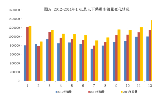 2014年,1.6升及以下排量乘用車市場(chǎng)占有率基本持平,小排量汽車市場(chǎng)占有率逐步回升。2014年,1.6升及以下排量乘用車全年共銷售1314.60萬(wàn)輛,同比增長(zhǎng)10.25%;占乘用車銷售市場(chǎng)的66.73%,較2013年增長(zhǎng)0.22個(gè)百分點(diǎn);占汽車銷售市場(chǎng)的55.96%,較2013年增長(zhǎng)1.75個(gè)百分點(diǎn)。